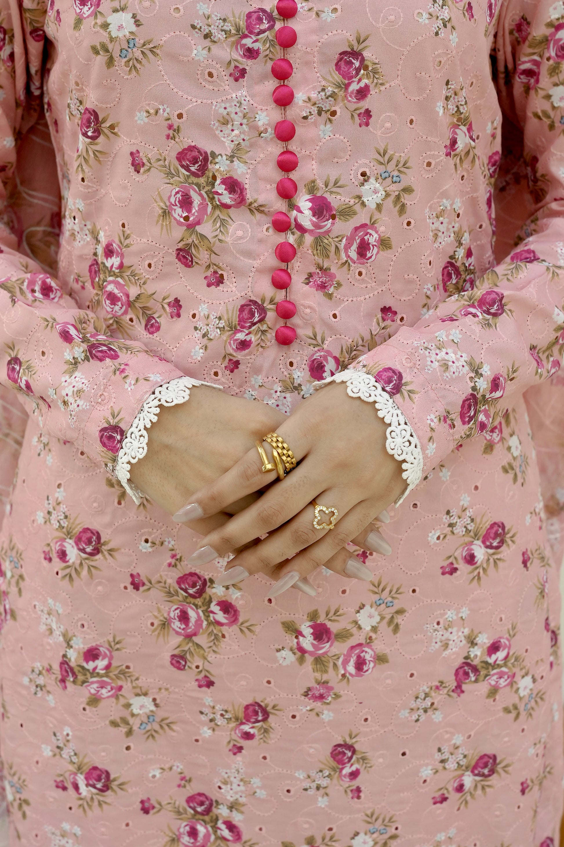 Bahar shirt is a chikan long full sleeves shirt having potli button detailings on neckline and sleeves finished with white woven lacing on sleeves.