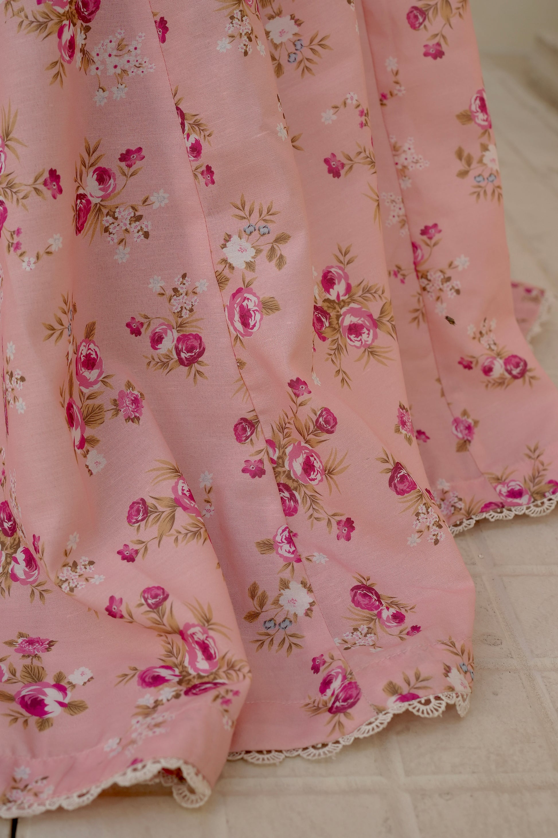 Hoor is a pink printed chikankari 12 panelled, three quarter sllleved frock, with beautiful sweetheart neckline. Having lace details on sleeves and daman.