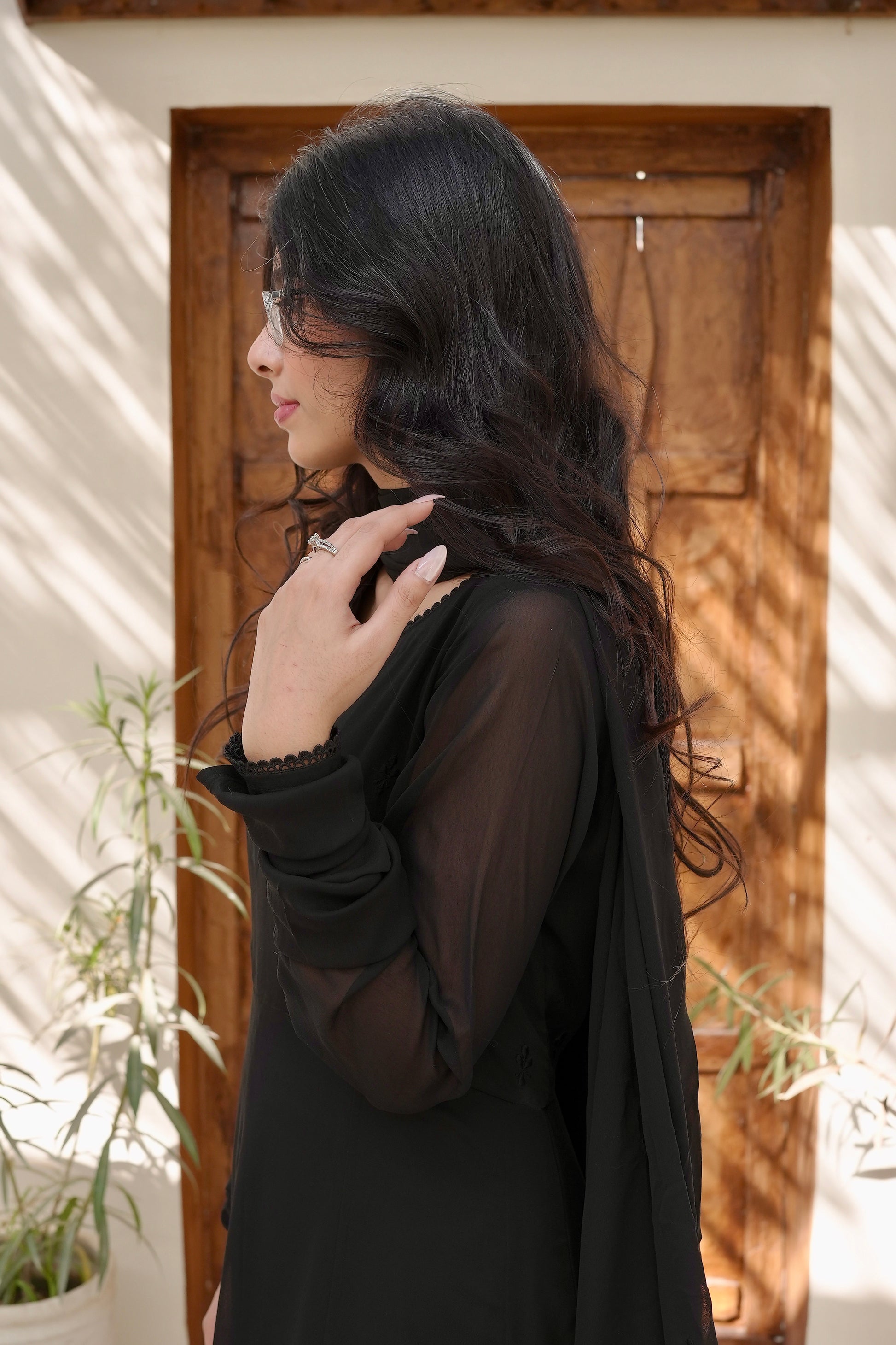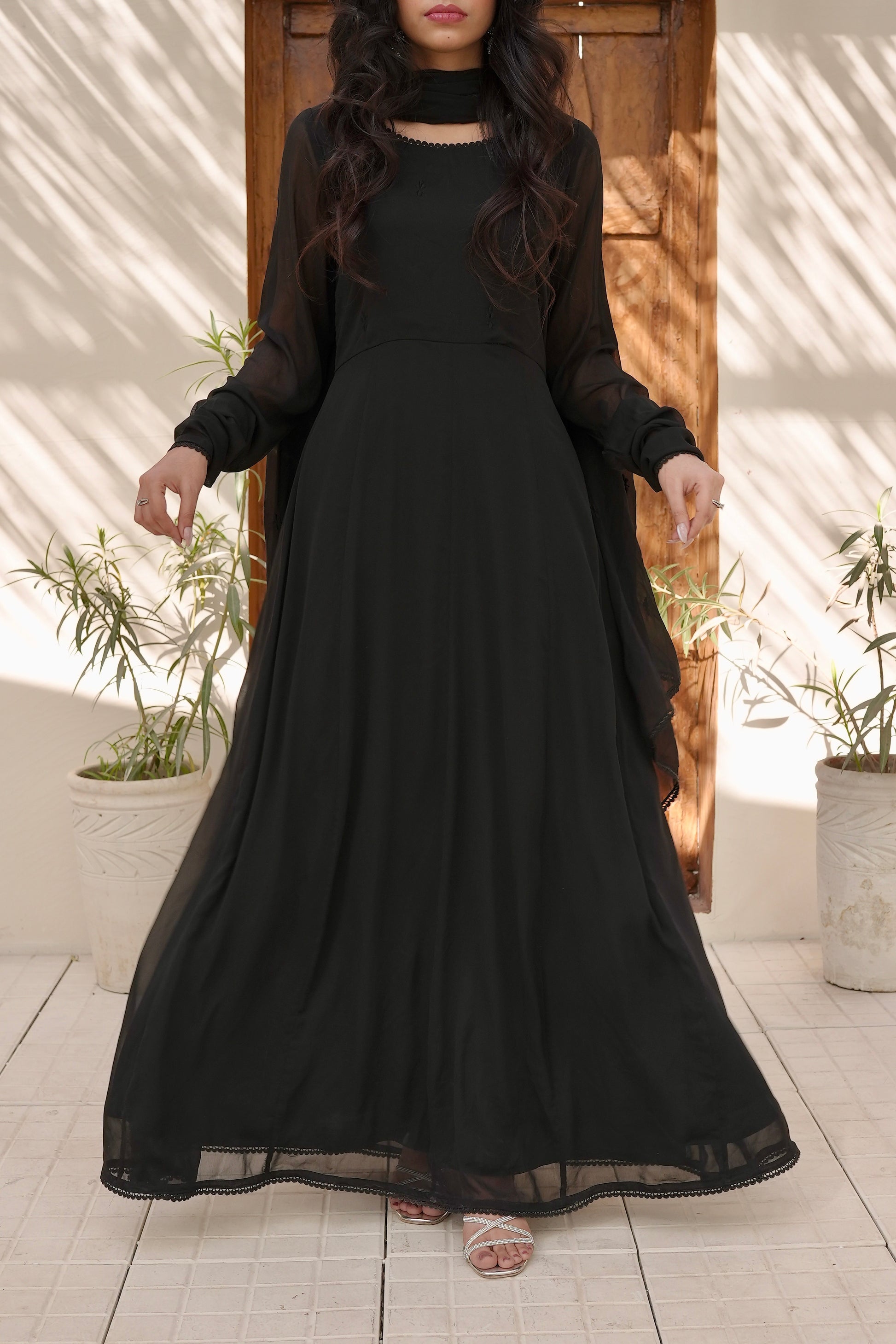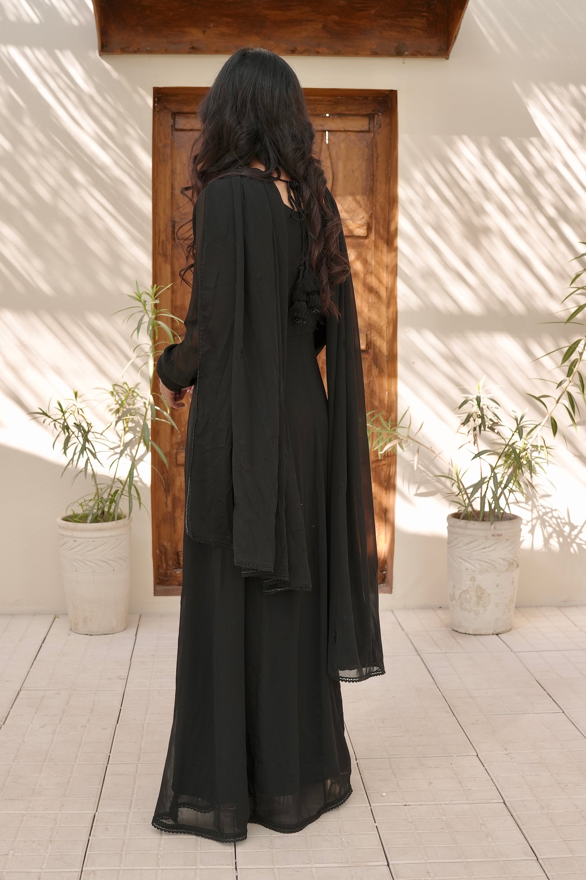 Jaana is a black georgette churidar sleeved, 12 panelled frock with delicate embroidered butti detailing on body finished with beautiful lace and a resham crystal dori on back neckline.