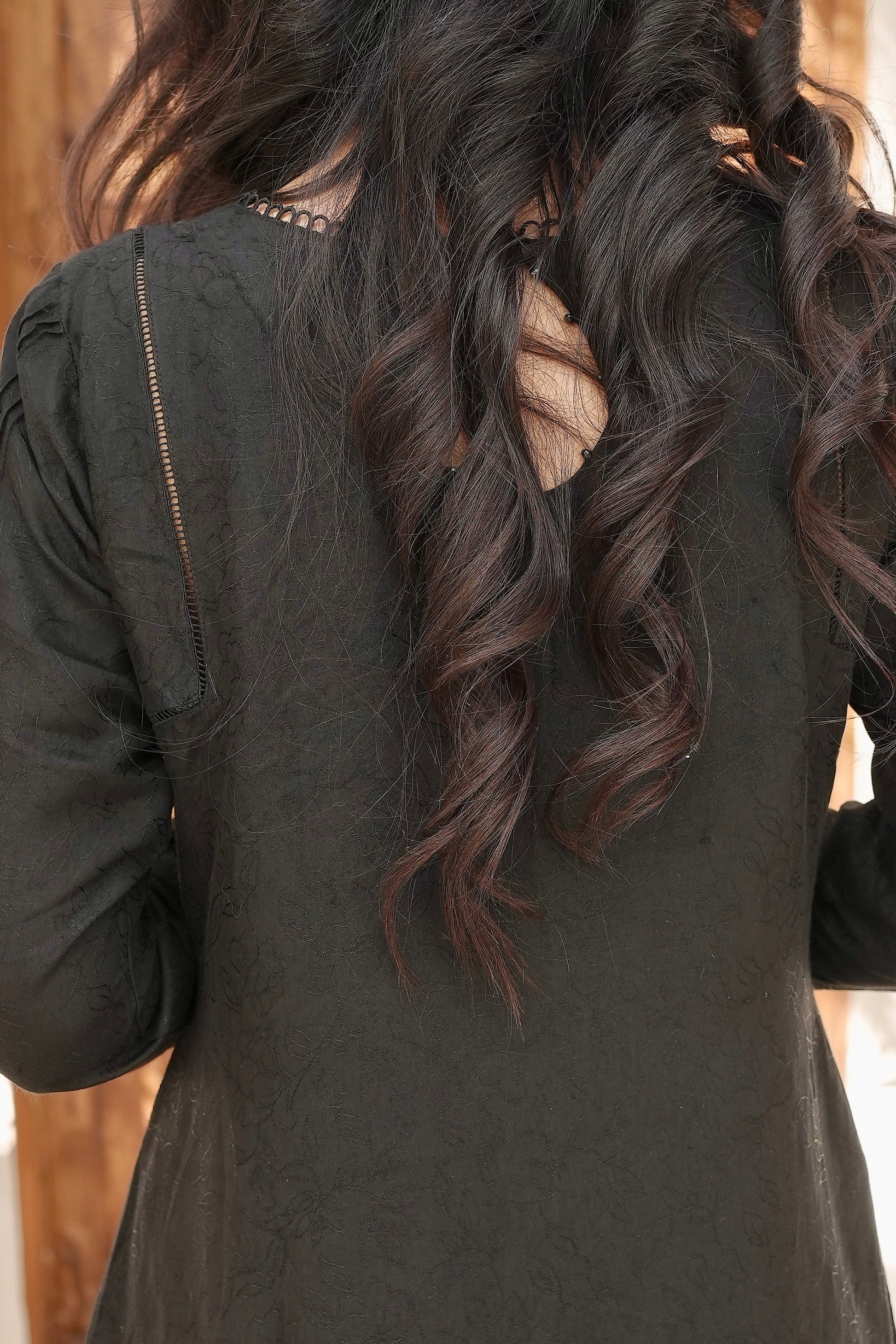 Mehtaab is a full-length frock made from lightweight and breathable viscose fabric with a subtle self-design. It has a graceful boat neck neckline, enhanced by box lacing extending from the shoulder to the armhole. The frock features delicate lace along its hemline and full sleeves, adorned with lace details. Completing the look with a hollow cut design at the back, adorned with sparkling crystals.