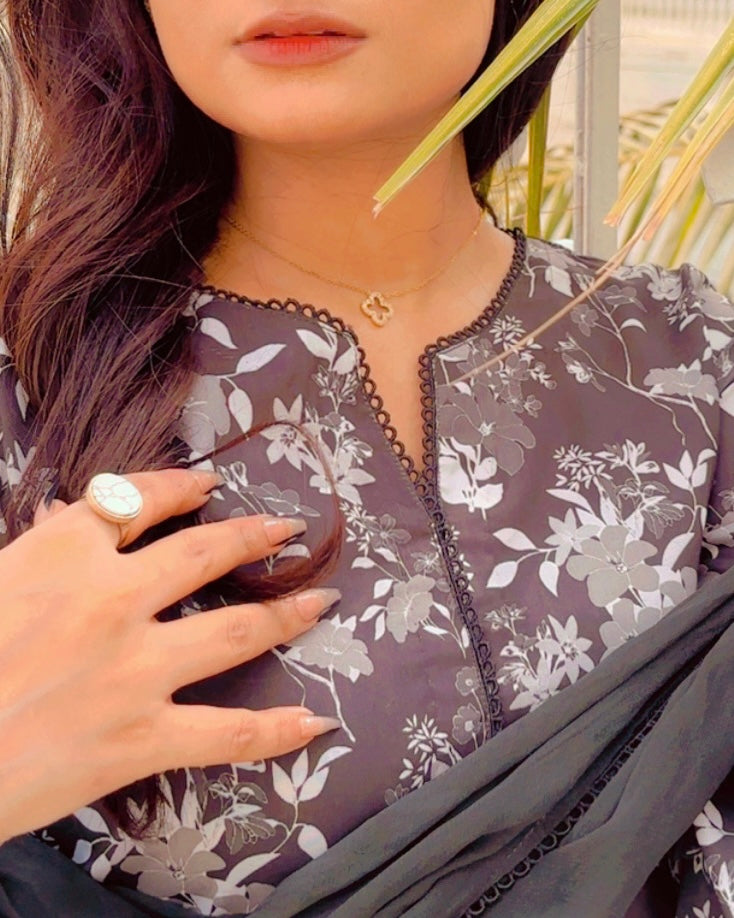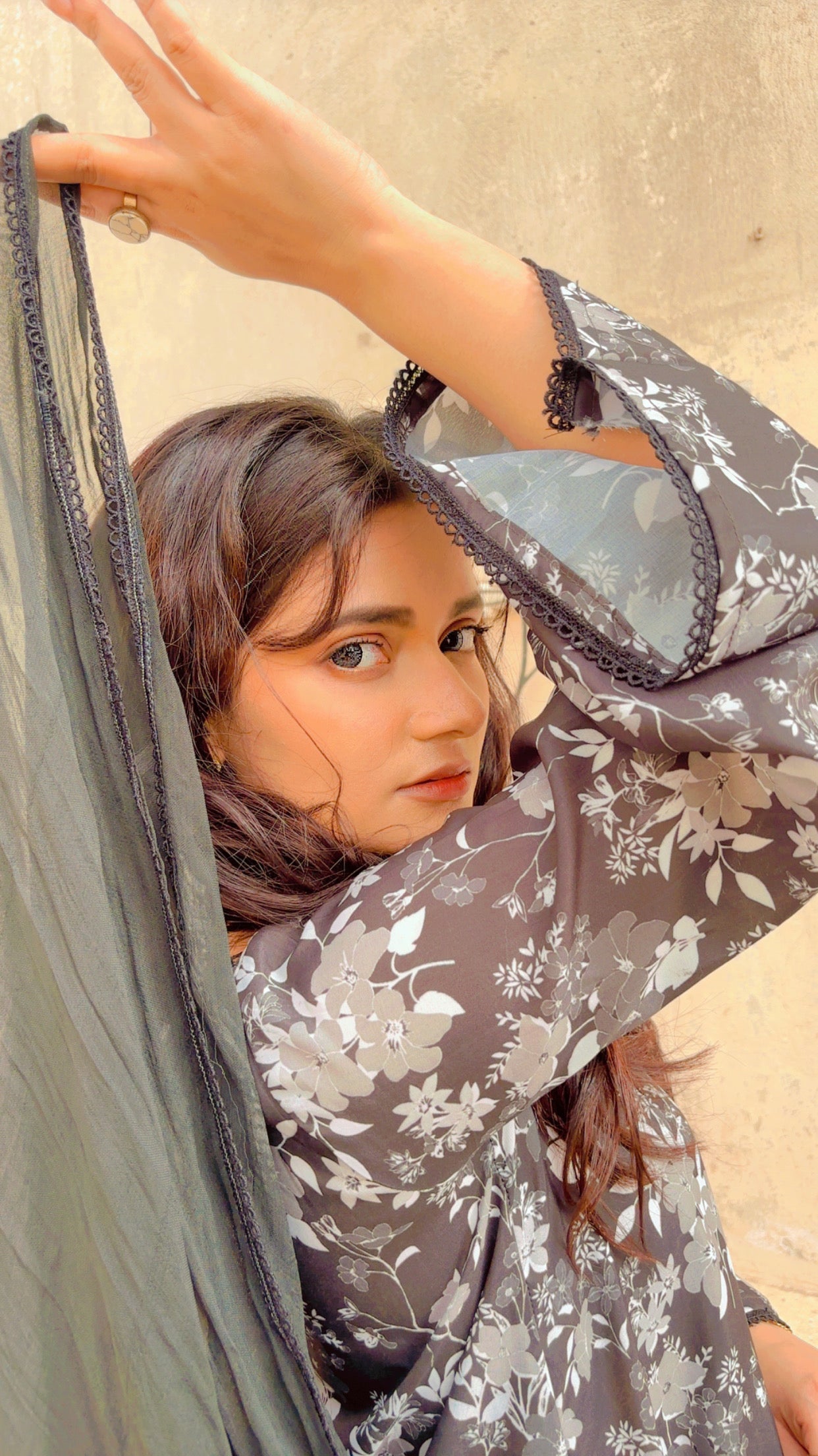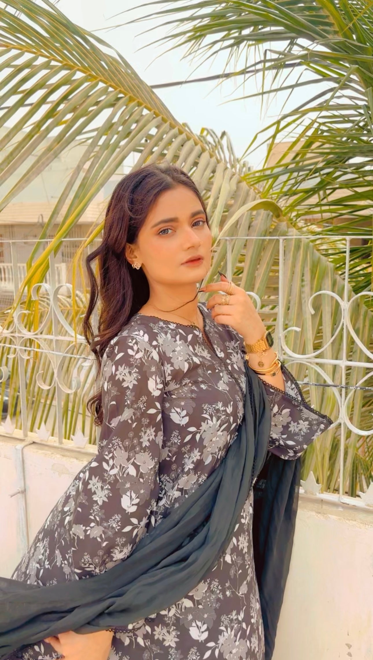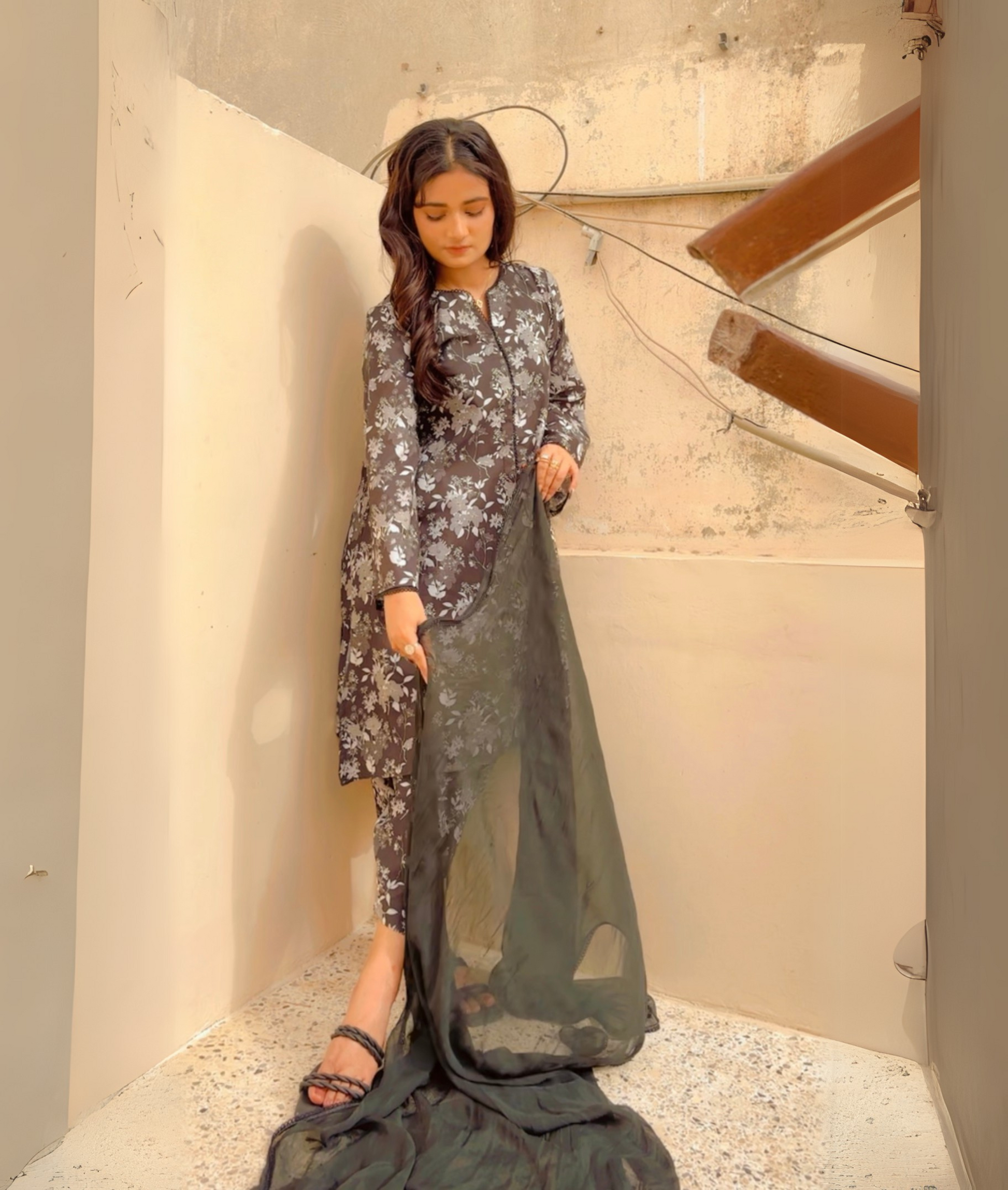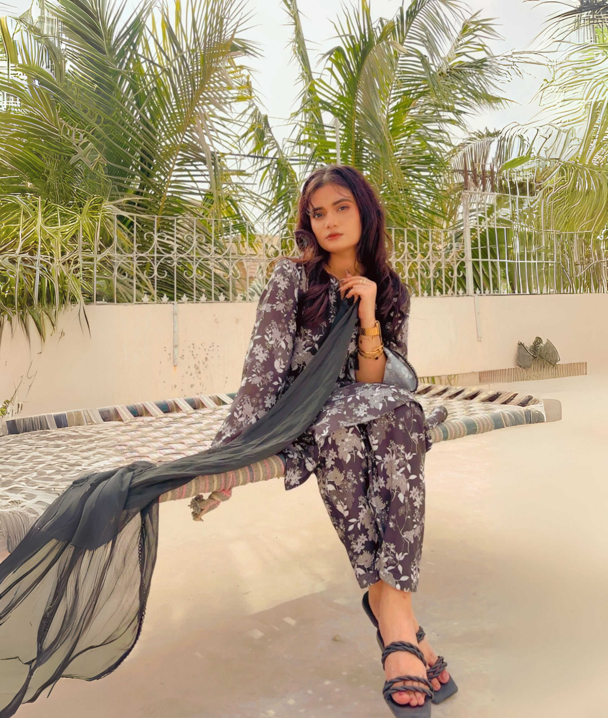 Say hello to laid-back luxe! Qurb is a 3-piece stunner with flowy bell sleeves, a round V-slit neckline, and dreamy black lace details. Paired with a sleek shalwar (hello, zipper hems!) and a georgette dupatta that brings all the drama.